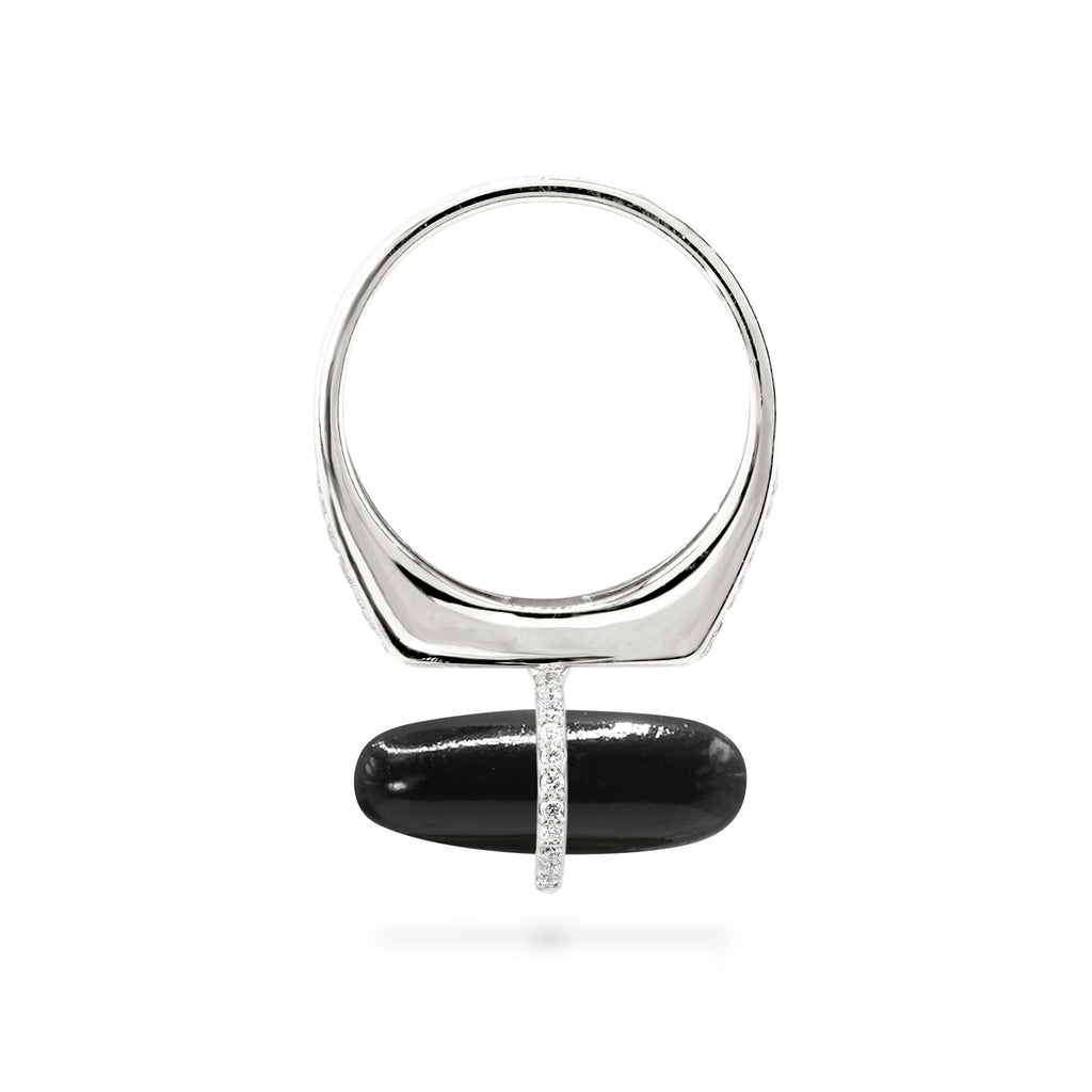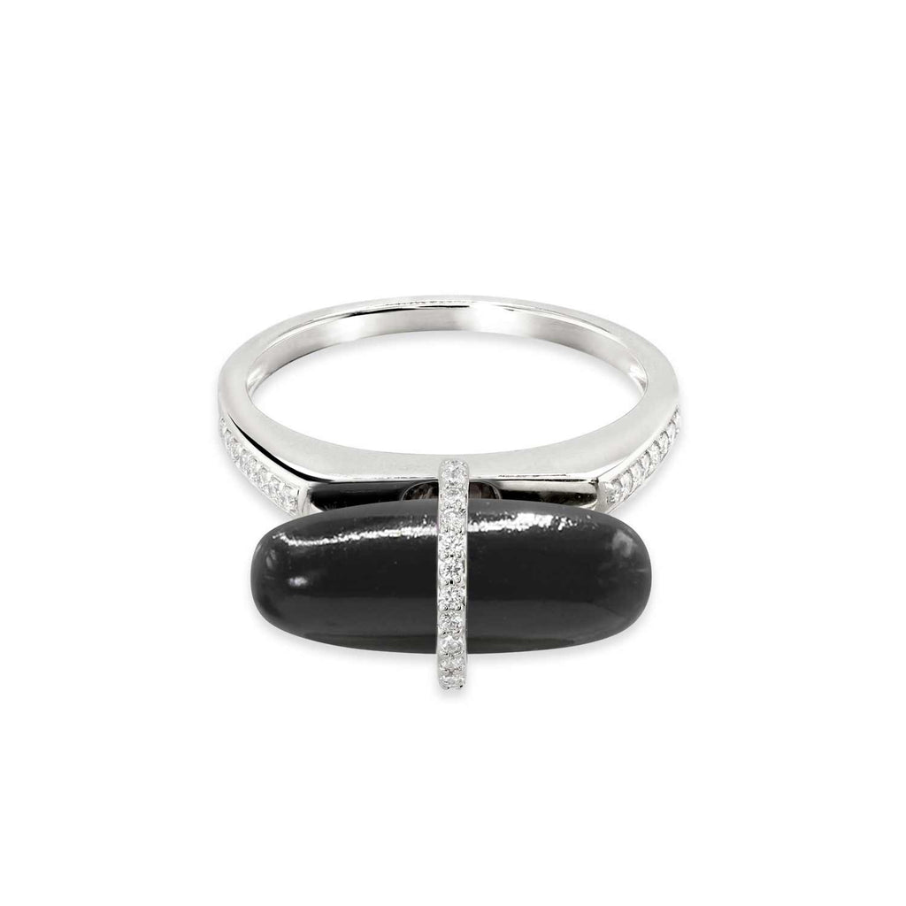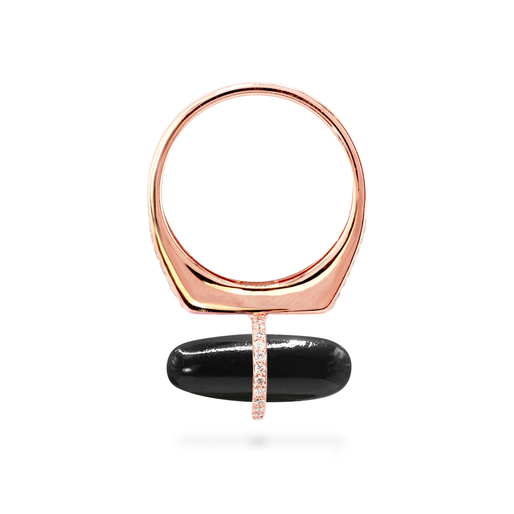 This black crystal ring displays an elegant and smooth black onyx capsule drop sitting artfully on a diamond-studded harness bail, providing an energetic boost of confidence with renewed self-control and courage to overcome personal battles. This black onyx stone ring is crafted in solid 14k gold, finished with a band ring, making it the ultimate selection for men and women.