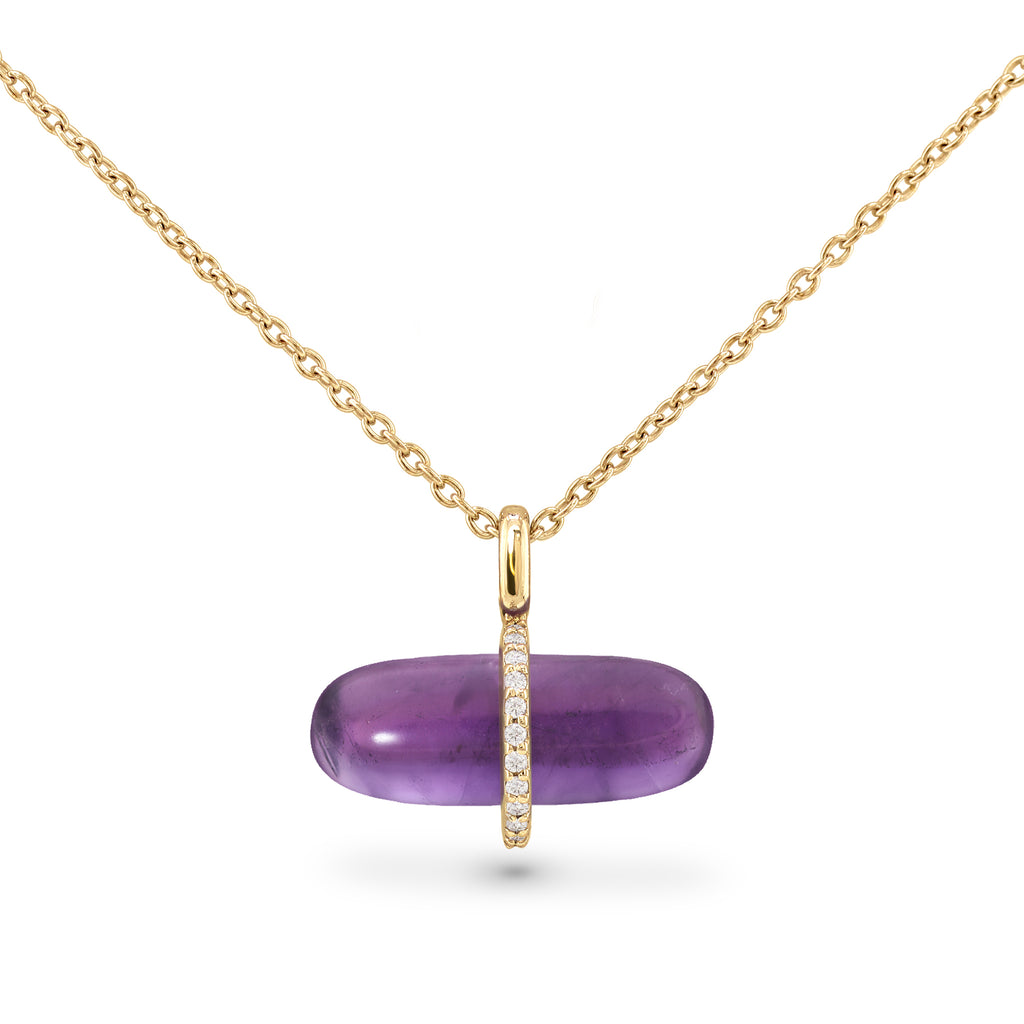 Amethyst is said to keep drunkenness away, known as a powerful sobering stone with its gorgeous, rich purple shade, the ultimate color of royalty. This amethyst gold necklace features a smooth amethyst capsule pendant studded with glittering diamonds in a modern design. A mini bail with a dainty chain threaded through gives this timeless necklace an effortless look of everyday we arability for men and women.