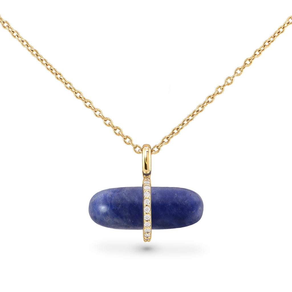 A combination of colors reminiscent of soft white clouds and a deep sky make the blue aventurine quartz a potent energy crystal, instilling calmness and tranquility for the wearer or metaphysical practitioner. This brightly polished 14k gold pendant necklace for men and women features a diamond-studded harness design holding a blue aventurine chill pill in place, beautifully strung on a delicate cable chain.