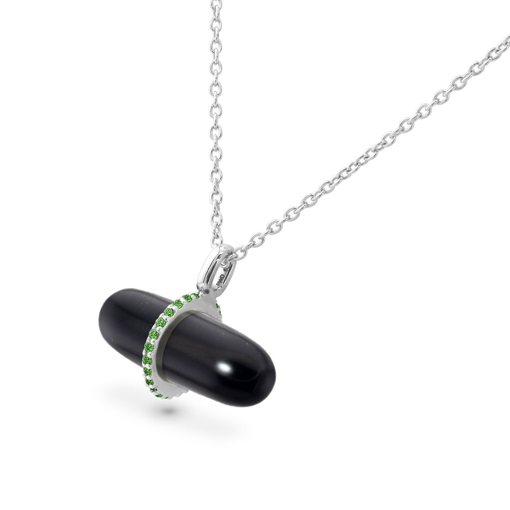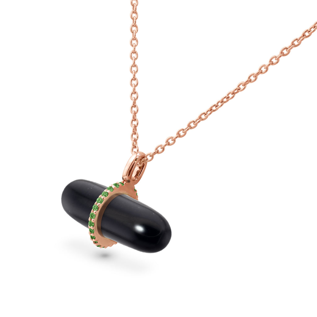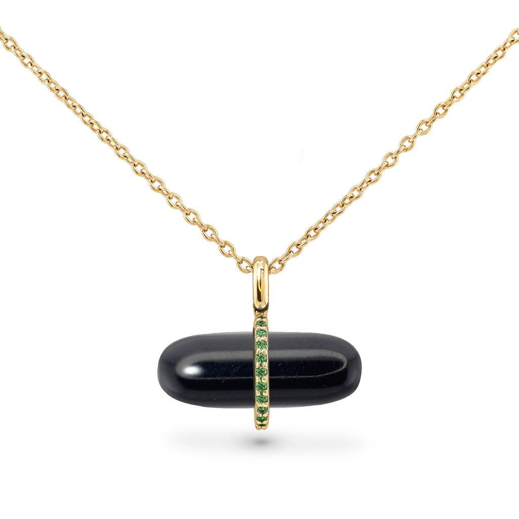 *14K Solid Gold PILLGEM Pendant Natural 5.65 carat Black Onyx with 0.11ct Emeralds, with 50cm Gold Chain.