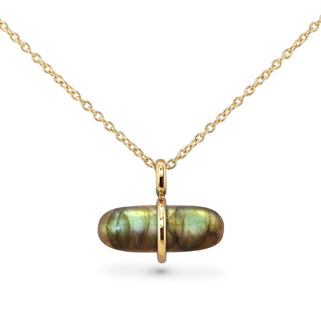 Nothing compares to the striking labradorite, a crystal shimmering with rustic colors and intriguing growth patterns. This labradorite pendant necklace features a chill pill labradorite, storing mysterious magic from nature deep within as it emanates soothing, peaceful vibrations. This timeless necklace is finely crafted in rich 14k solid gold, delicate, and perfect for layering.