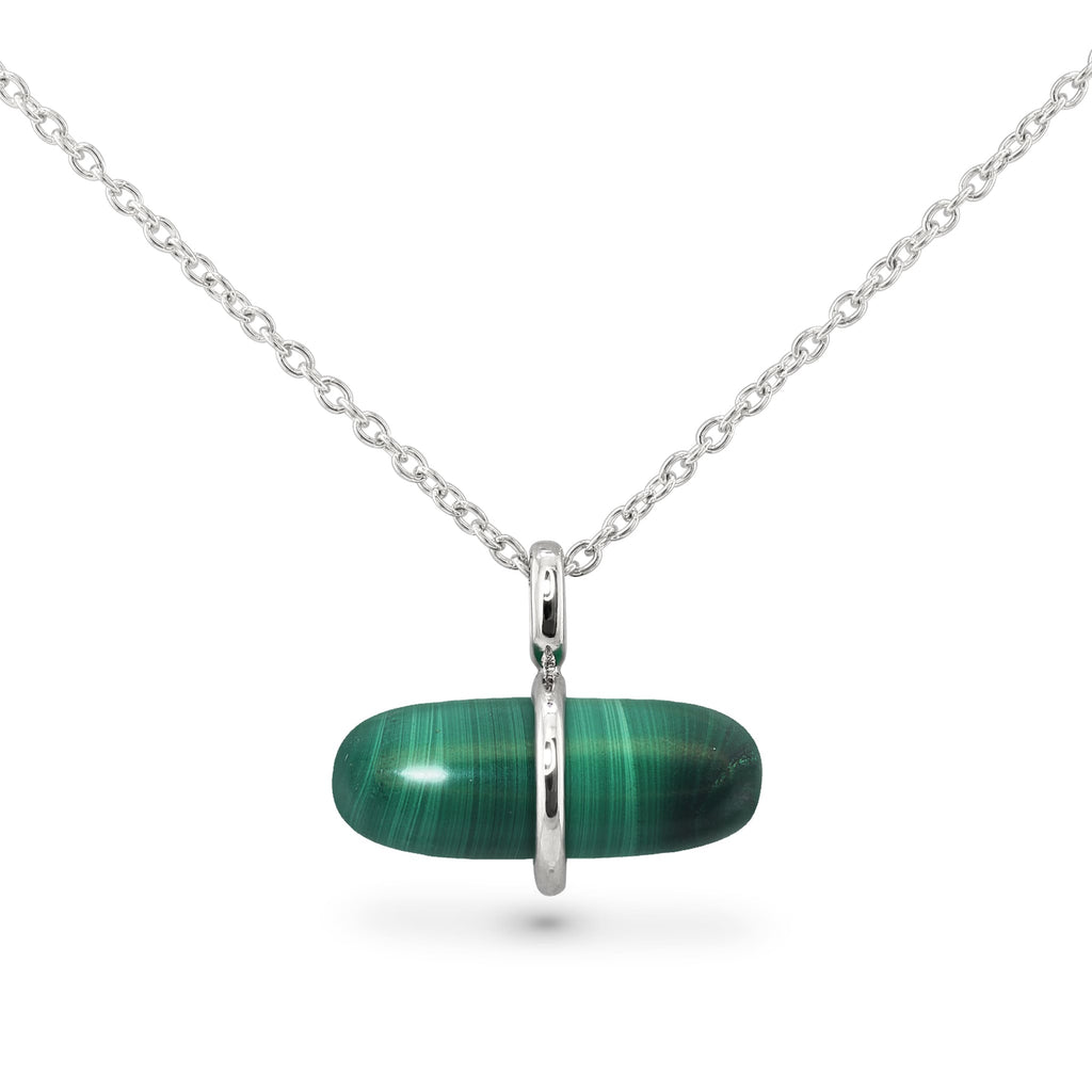 Celebrate everyday joy and buoyancy with this modern real malachite crystal necklace! This innovative, delicate design features a smooth malachite chill pill displaying its trademark banded green. Allow malachite to emanate peace and remove negative, toxic vibrations from the aura and environment with this beautiful gemstone necklace, crafted in solid 14k gold.